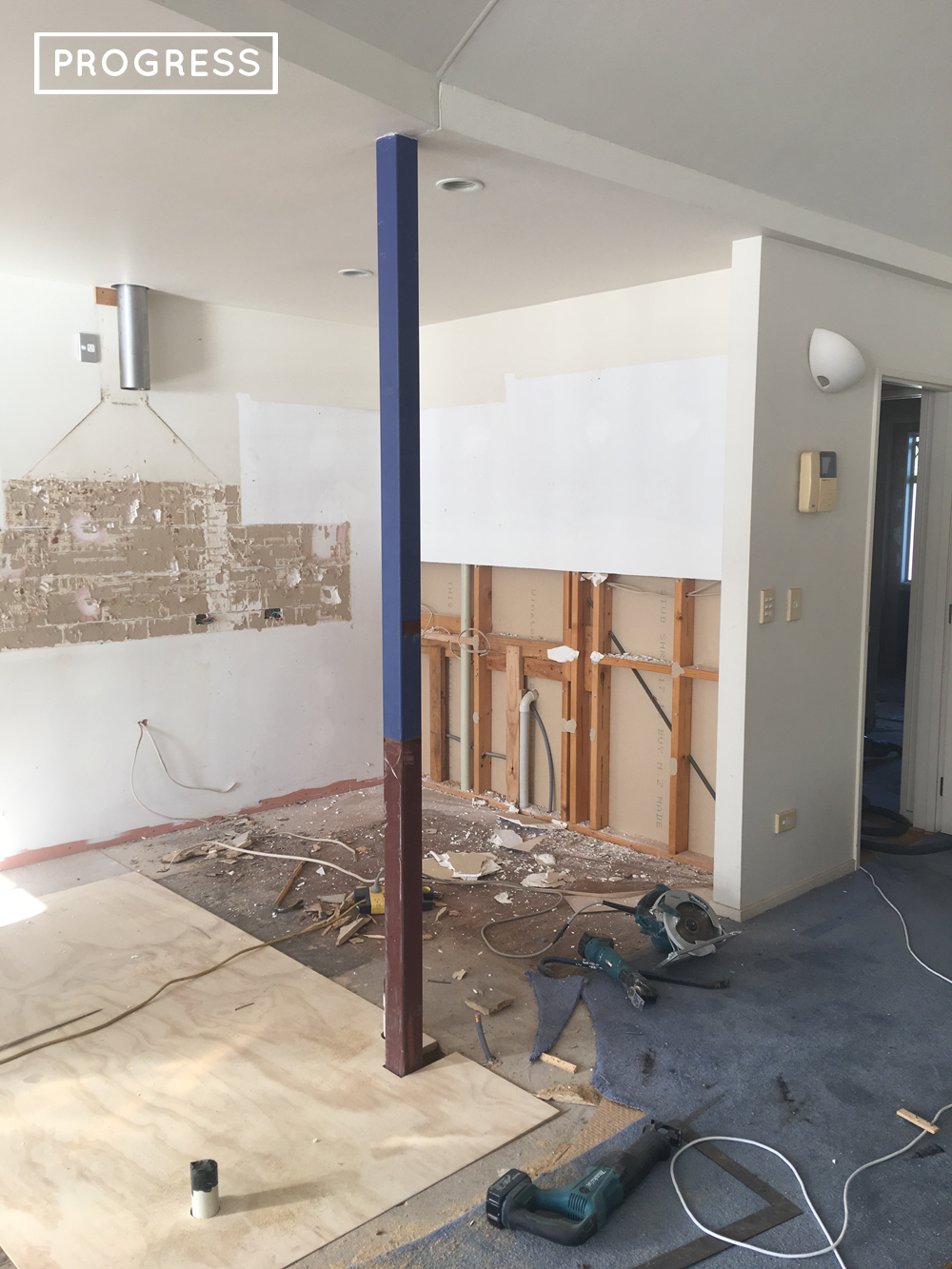 The first thing we did was to meet with our builder, Paul Davidson of Bay Carpenters, and get an engineer in to see if we could remove the pole. as it was going to seriously compromise whatever we designed for the new kitchen. We were so happy (that’s an understatement) when we were told it could be done. It required a steel beam added in the ceiling which we had drawn up and submitted to council by our friend, Andrew Mitchener of Mitchener Architecture & Design.