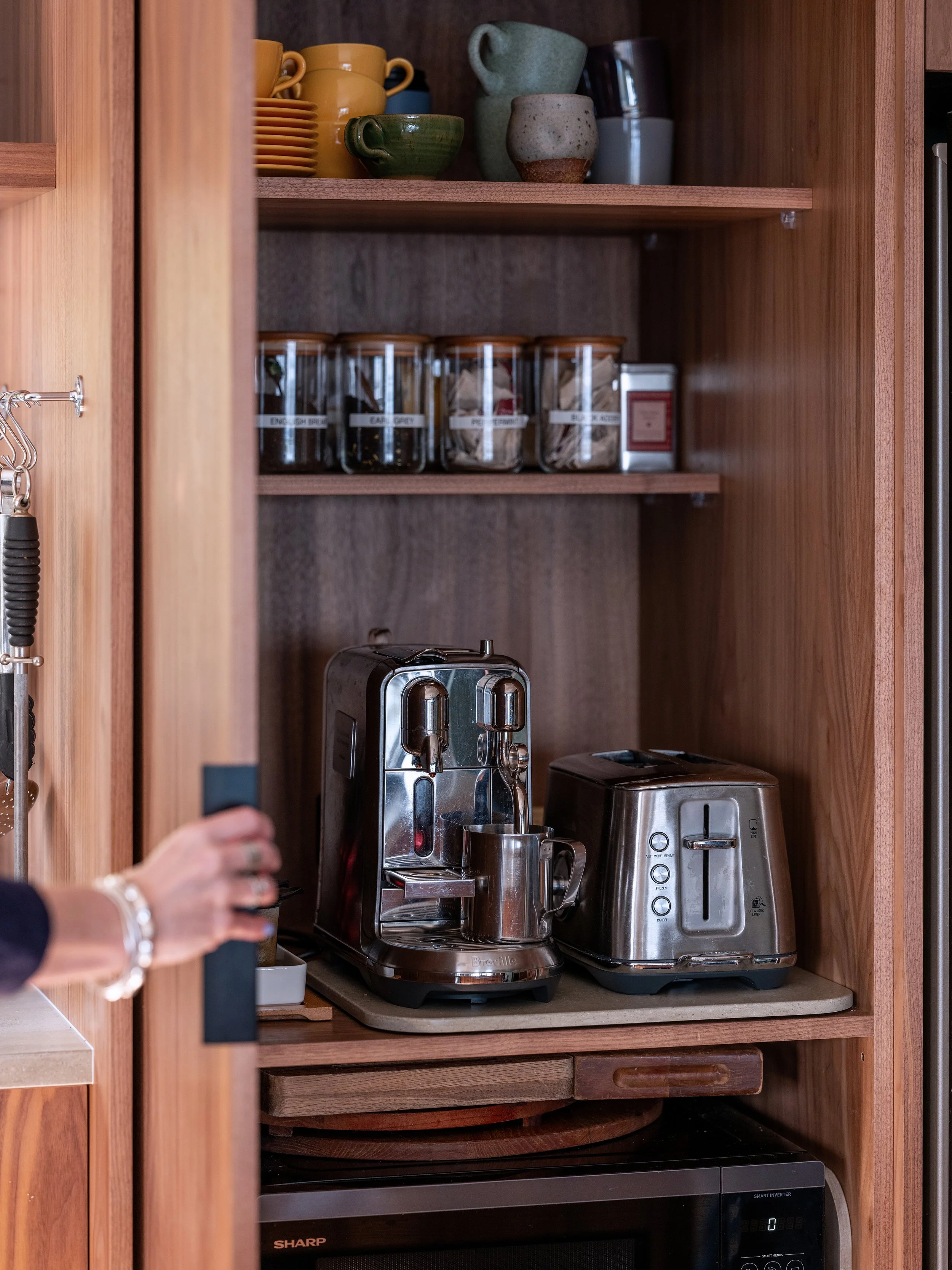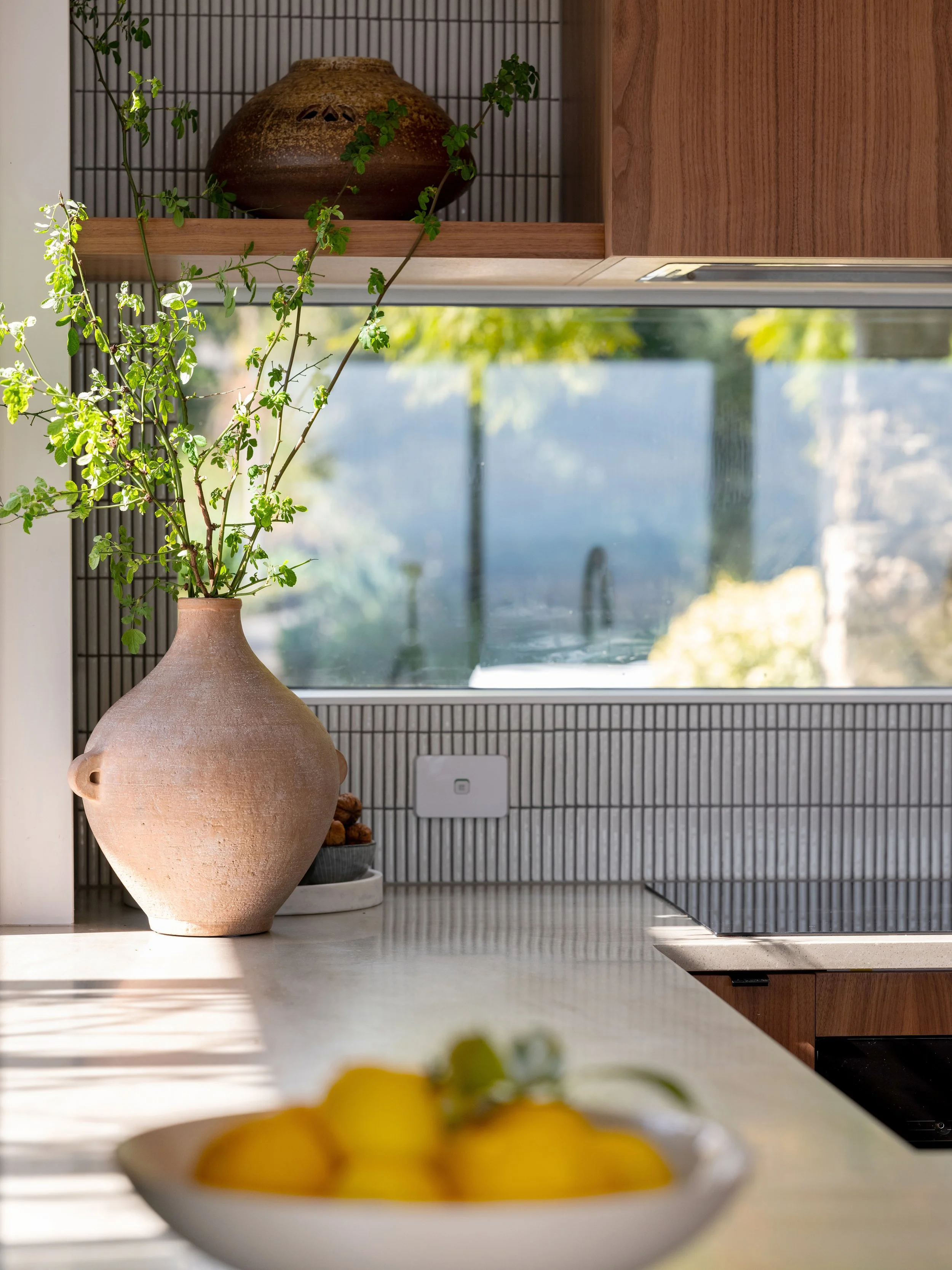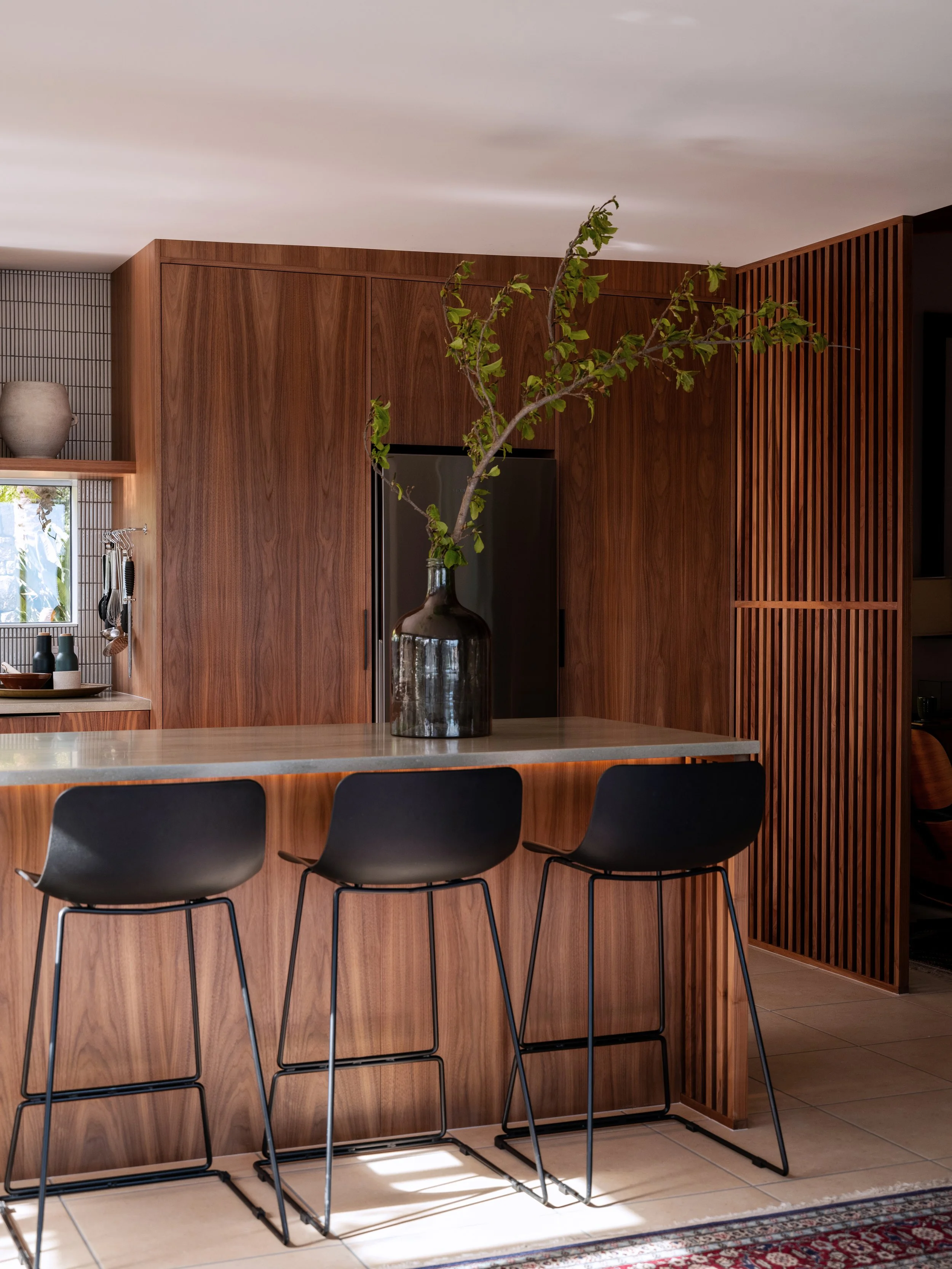 The brief from our clients for their kitchen renovation was to address storage and functionality and give them an aesthetic of Mid Century meets Japanese meets minimalism. We’d previously chosen the deep green wall colour, and teamed this with a stunning walnut veneer and latté coloured Corian benchtop. Clever solutions used to help with the functionality include pocket doors on the pantries, pull-out corner cupboards, and a handy warming drawer. A slatted walnut screen was used to provide privacy to the adjoining study/living space while still allowing light to filter through.
